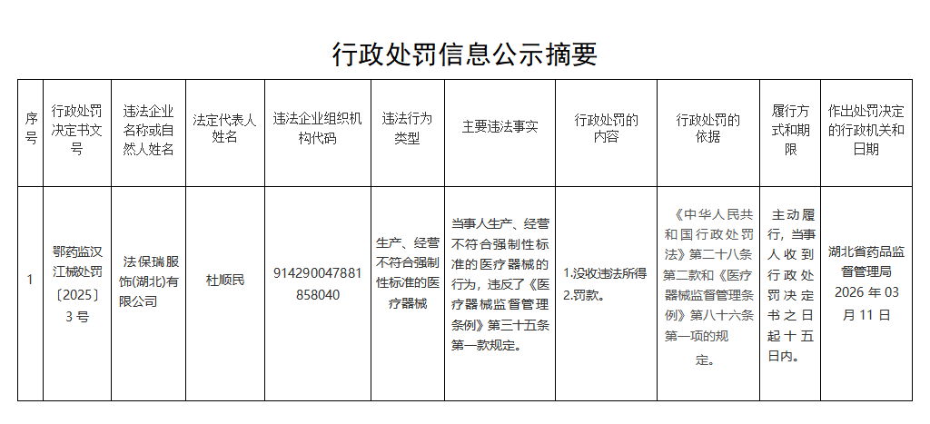 行政处罚信息公示摘要(法保瑞服饰(湖北)有限公司)