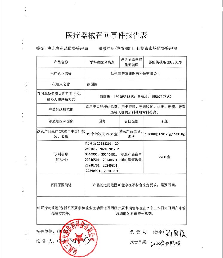 仙桃三楚友康医药科技有限公司对生产的牙科藻酸分离剂主动召回