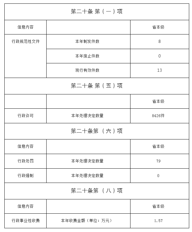 (一)政府信息主动公开情况。2021年,省药监局全面推进决策、执行、管理、服务、结果公开,累计公开政府信息1800条,发布问卷调查征集民意2次,发布在线访谈4期,征求公众和企业意见3次。注重公众知情权,促进监管信息公开。发布4期药品(医疗器械、化妆品)质量公告,公开2期不良反应监测情况的通报,省本级公开行政处罚信息79条。行政许可实行100%公开,实时查询事项办理进度。