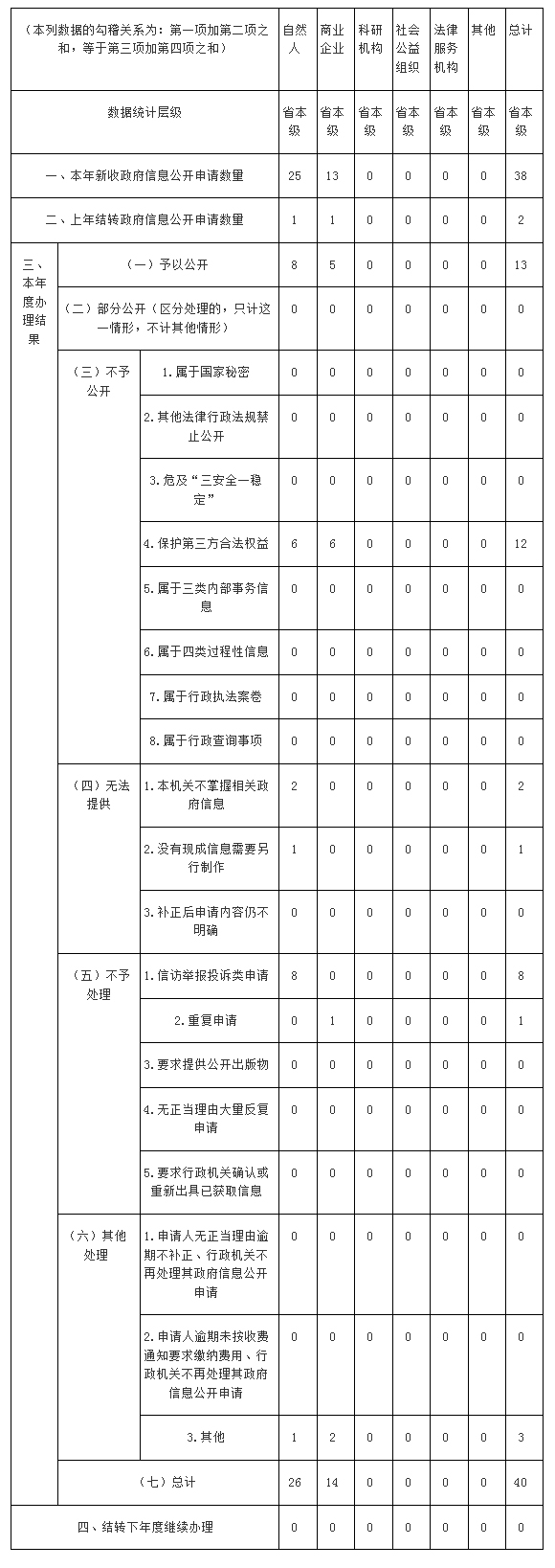 (二)政府信息依申请公开情况。省药监局办结依申请公开40件。其中,上年度结转办结2件,本年度受理办结38件。全年依法依规办理政府信息公开申请,受理的公开申请全部在法定时限内作出答复,且未收取任何费用,依法保障了公众合理信息需求。
