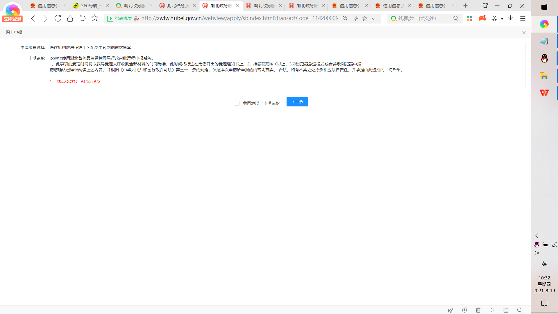 9、在网上申报界面,勾选“我同意以上条款”,并点击“下一步”